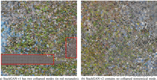 t-SNE是检验综合分布和评估其多样性的良好工具,利用 t-SNE去对由StackGAN-v1和StackGAN-v2在CUB测试集上生成的图片做模型的坍塌实验。结果显示StackGAN-v1会有两个部分的模式坍塌,而StackGAN-v2没有: