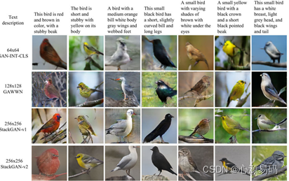将失败分为轻度、中度和重度。轻度指生成的图像具有平滑、连贯的外观,但缺少生动的对象;中度指生成的图像具有明显的伪影,通常是模式崩溃的迹象;重度指表示生成的图像处于模式崩溃。通过实验发现StackGAN-v2能有效避免模式崩溃的重度失败。
