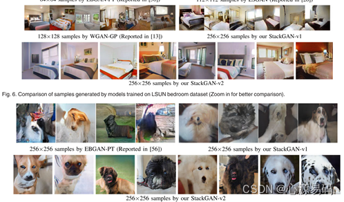 实验证明:StackGAN-v2显示出更稳定的训练行为,并在大多数数据集上获得更好的FID和初始分数,且相比v1来说,其不会出现模式崩溃的问题。