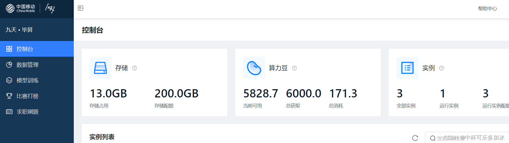 进入后可以看到存储空间,算力豆(九天毕昇算时的计算单位)和自己建立过的实例。