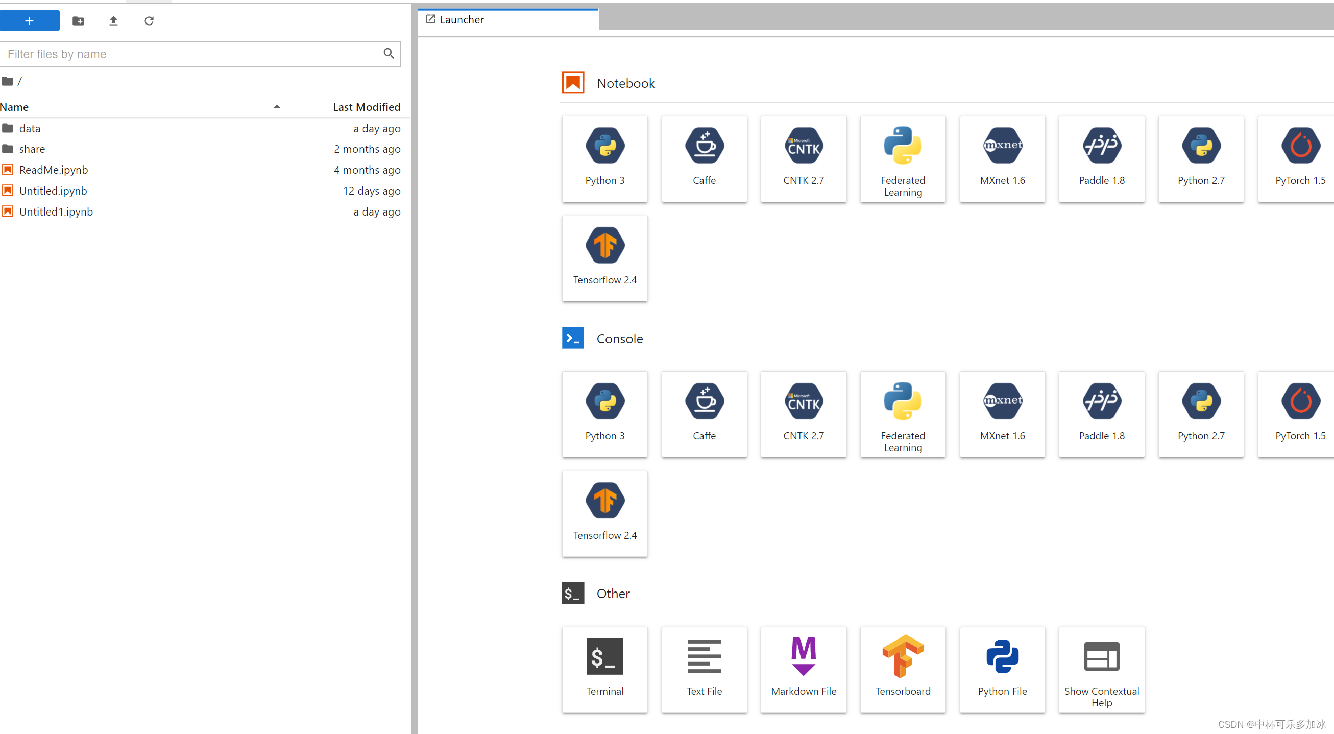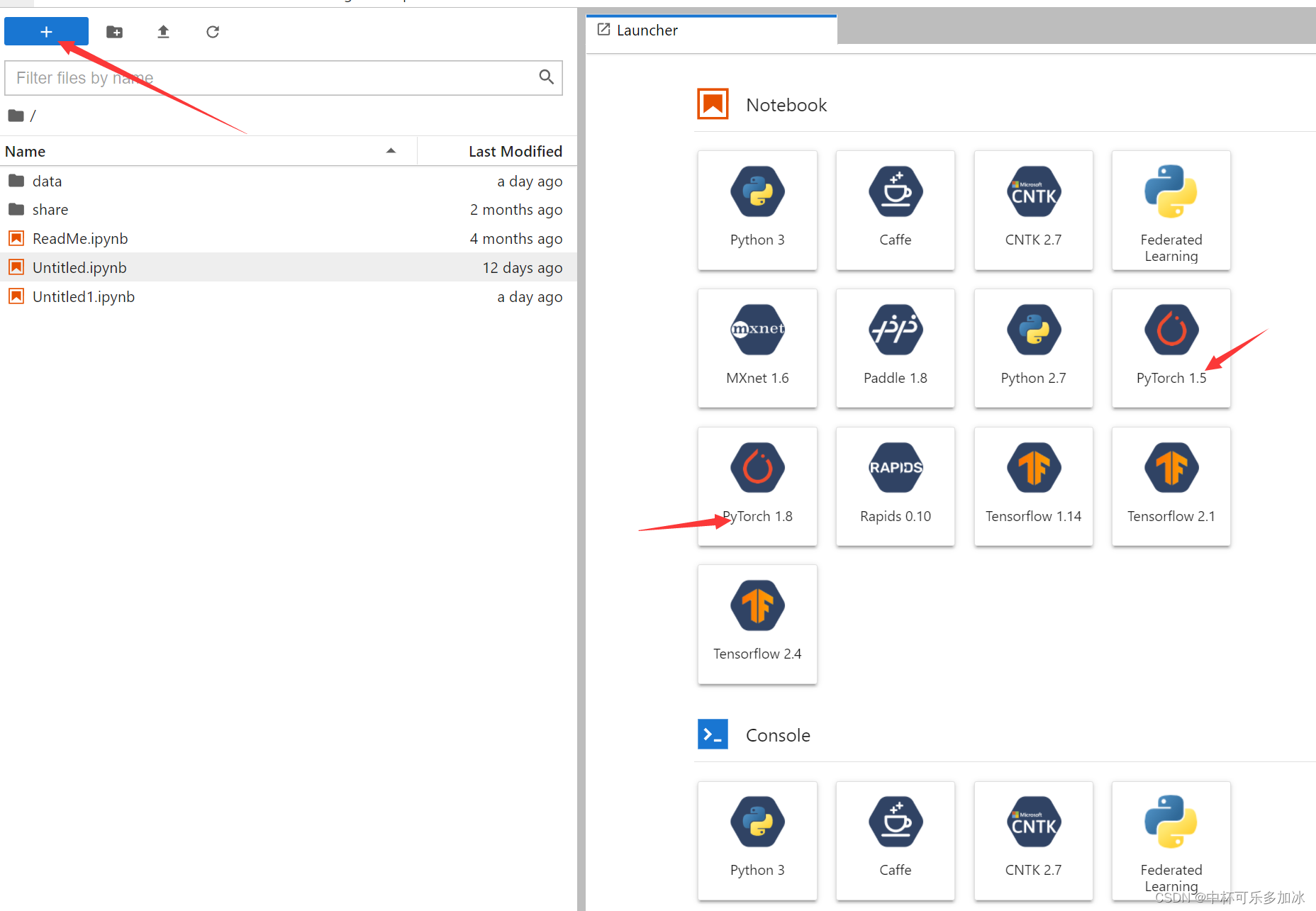 我们点击左上角的蓝色加号,新建一个notebook或者console或者最下面的terminal(看个人喜好),如果点击的是pytorch1.x,则平台就自动为了加载了最基础的pytorch环境。