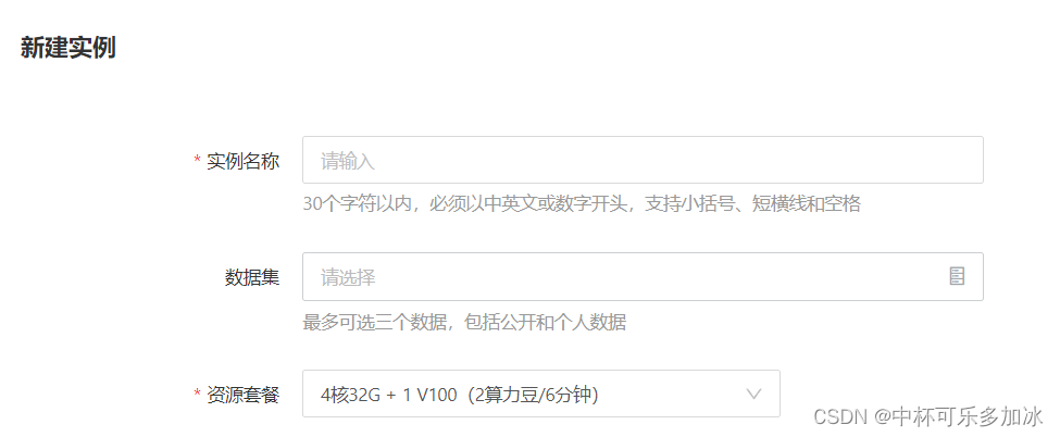 部分数据集,没有的数据集需要自己在数据管理或者在运行实例时进行上传)选择资源套餐。