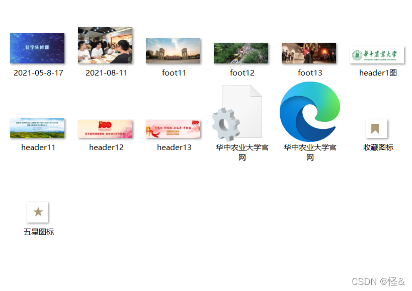 将“ 一 ”中的HTML代码、“ 二 ”中的CSS代码,“ 三 ”中的11个图片按各自要求命名,放至同一文件夹下,打开“ 华中农业大学官网.html ”与“ 华中农业大学官网.css ”,在html中运行。