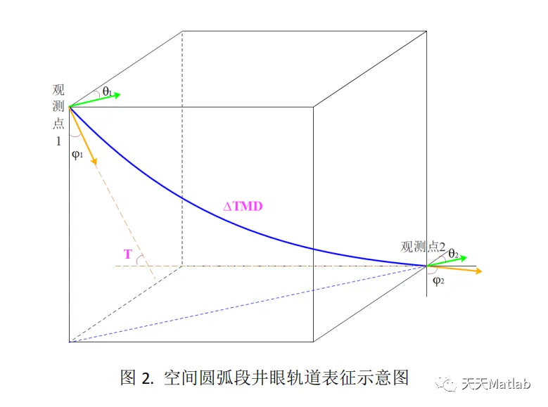 的每个井段,通过表征三维井眼轨道所需要的特征参数将观测点 1 到观测点 2