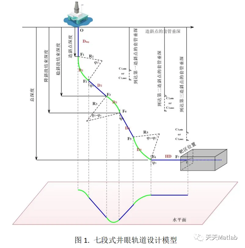 七段式井眼轨道设计模型由空间上的圆弧(如增斜段、扭方位段)和直线(如