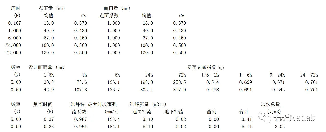 %zm--演算结果:[初始水位m 最高水位m 水位上涨m 初始库容1e4m3 最大库容1e4m3 调洪库容1e4m3 入库洪峰m3/s 最大泄量m3/s 洪峰削减m3/s]