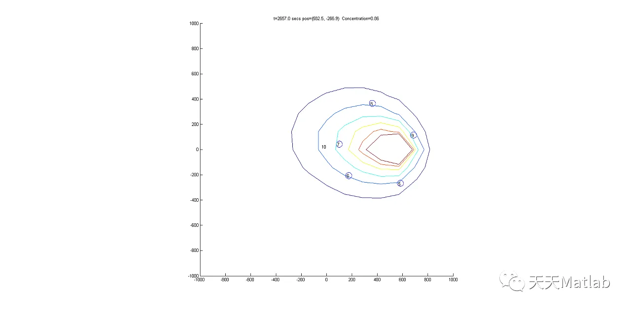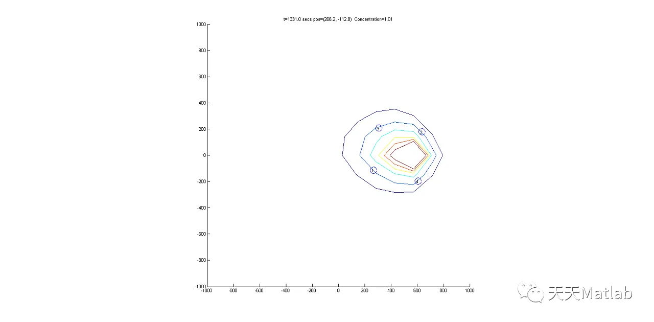 title(sprintf('t=%.1f secs pos=(%.1f, %.1f) Concentration=%.2f',t, uav(1).get_real_x,uav(1).get_real_y,uav(1).p))