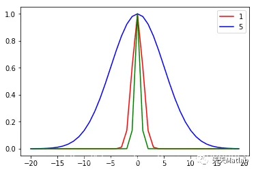 高斯核函数的图像如图8所示,其中横轴是到中心的距离。当距离等于0时,函数值等于1,距离越远衰减越快,其中参数称为方差(宽度),表示函数跌落到零的速度。红色线条,蓝色,绿色,越小图像越窄。