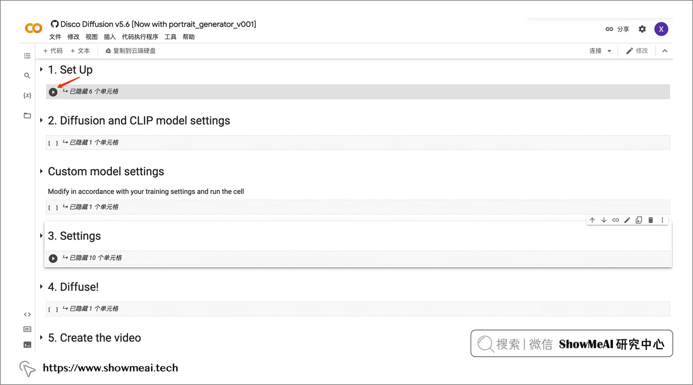 Colab项目中大家可以看到编号从 1-5 的对应步骤,我们只需按下运行代码的小播放按钮即可执行对应的代码。不过因为是定制作画,大家需要做一些设置和填入部分提示信息,如下步骤。