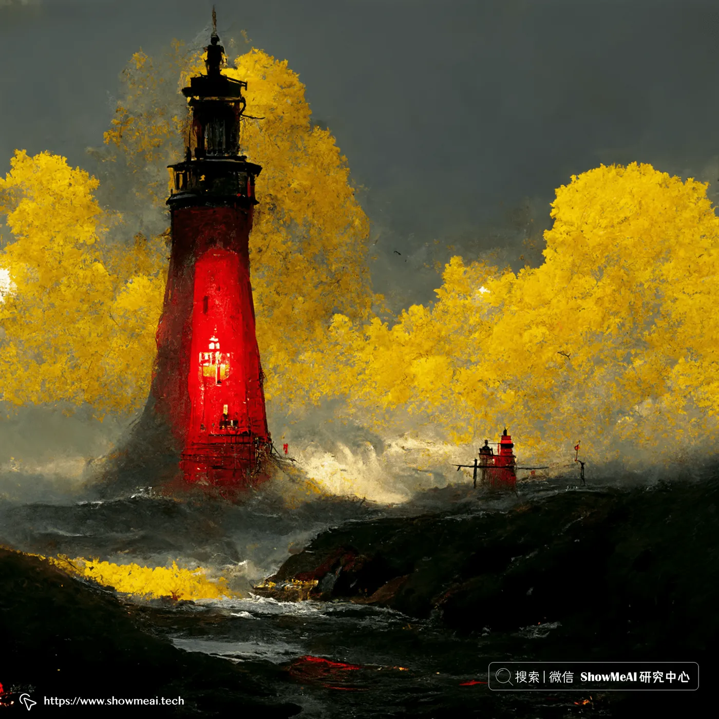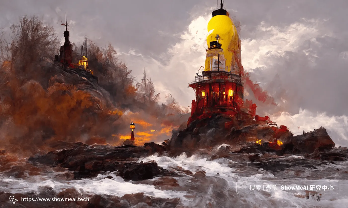 A beautiful painting of a singular lighthouse, shining its light across a tumultuous sea of blood by greg rutkowski and thomas kinkade, Trending on artstation.", "yellow color scheme"翻译成中文就是:一幅美丽的奇异灯塔画作,将光芒照耀在汹涌的红色海洋中。 greg rutkowski 和 thomas kinkade 的黄色配色方案,artstation网站上的流行趋势。