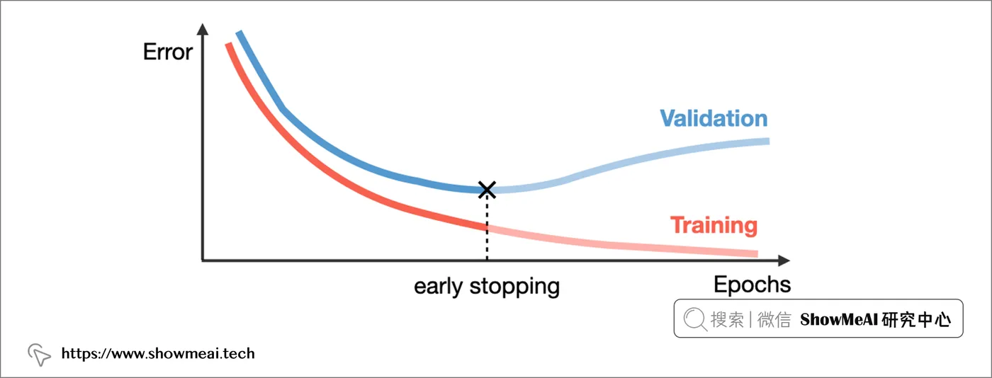 Early stopping早停止是一种判断迭代轮次的技术,它会观察验证集上的模型效果,一旦模型性能在验证集上停止改进,就会停止训练过程,它也经常被使用来缓解模型过拟合。