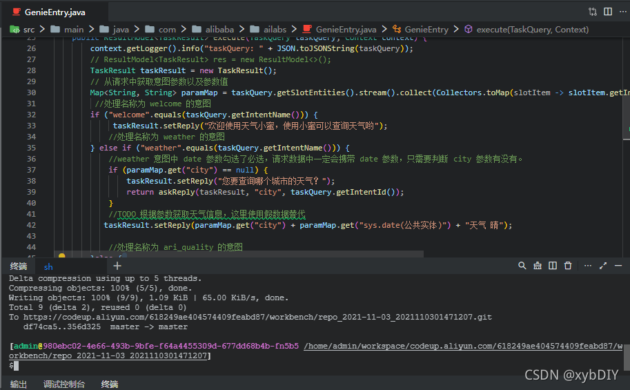 [admin@2776a5be-6dfb-4c7c-ade8-38edd23352d7-cf87b85b5-vh8zn /home/admin/workspace/codeup.aliyun.com/61518cd7ade19007d78e3930/workbench/repo_2021-11-01_2021110101453233] $git status On branch master Your branch is up to date with 'origin/master'. Changes not staged for commit: (use "git add <file>..." to update what will be committed) (use "git checkout -- <file>..." to discard changes in working directory) modified: src/main/java/com/alibaba/ailabs/GenieEntry.java no changes added to commit (use "git add" and/or "git commit -a") [admin@2776a5be-6dfb-4c7c-ade8-38edd23352d7-cf87b85b5-vh8zn /home/admin/workspace/codeup.aliyun.com/61518cd7ade19007d78e3930/workbench/repo_2021-11-01_2021110101453233] $git add src [admin@2776a5be-6dfb-4c7c-ade8-38edd23352d7-cf87b85b5-vh8zn /home/admin/workspace/codeup.aliyun.com/61518cd7ade19007d78e3930/workbench/repo_2021-11-01_2021110101453233] $git commit -m "Checktheweahter" [master 83cc356] Checktheweahter 1 file changed, 28 insertions(+), 4 deletions(-) [admin@2776a5be-6dfb-4c7c-ade8-38edd23352d7-cf87b85b5-vh8zn /home/admin/workspace/codeup.aliyun.com/61518cd7ade19007d78e3930/workbench/repo_2021-11-01_2021110101453233] $git push Counting objects: 9, done. Delta compression using up to 5 threads. Compressing objects: 100% (5/5), done. Writing objects: 100% (9/9), 1.69 KiB | 101.00 KiB/s, done. Total 9 (delta 1), reused 0 (delta 0) To https://codeup.aliyun.com/61518cd7ade19007d78e3930/workbench/repo_2021-11-01_2021110101453233.git cd0452b..83cc356 master -> master [admin@2776a5be-6dfb-4c7c-ade8-38edd23352d7-cf87b85b5-vh8zn /home/admin/workspace/codeup.aliyun.com/61518cd7ade19007d78e3930/workbench/repo_2021-11-01_2021110101453233] $