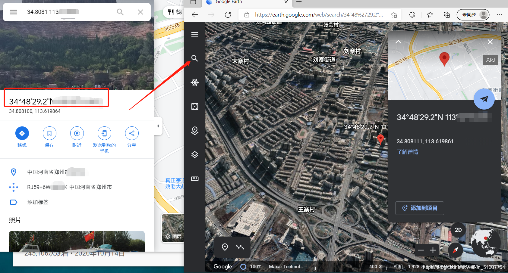将下图中的经纬度放到earth.google.com搜索,要使用电脑自带的微软浏览器,亲测google和火狐浏览器不太行