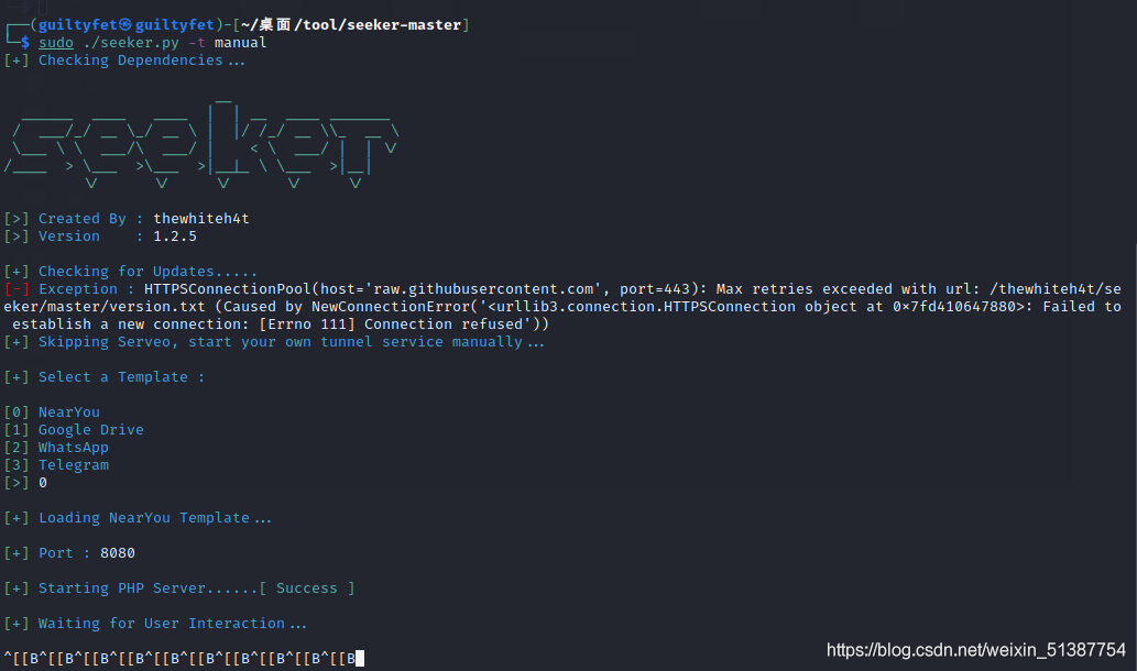 ──(guiltyfet㉿guiltyfet)-[~/桌面/tool/seeker-master] └─$ ls -l 总用量 60 -rwxr-xr-x 1 guiltyfet guiltyfet 500 5月 6 17:07 arch_install.sh drwx------ 2 guiltyfet guiltyfet 4096 5月 6 17:07 db -rw-r--r-- 1 guiltyfet guiltyfet 230 5月 6 17:07 Dockerfile -rwxr-xr-x 1 guiltyfet guiltyfet 483 5月 6 17:07 install.sh -rw-r--r-- 1 guiltyfet guiltyfet 1068 5月 6 17:07 LICENSE drwx------ 2 guiltyfet guiltyfet 4096 5月 6 17:07 logs -rw-r--r-- 1 guiltyfet guiltyfet 181 5月 6 17:07 metadata.json -rwxr-xr-x 1 guiltyfet guiltyfet 5203 5月 6 17:07 README.md -rwxr-xr-x 1 guiltyfet guiltyfet 10930 5月 6 17:07 seeker.py drwx------ 6 guiltyfet guiltyfet 4096 5月 6 17:07 template -rwxr-xr-x 1 guiltyfet guiltyfet 473 5月 6 17:07 termux_install.sh -rw-r--r-- 1 guiltyfet guiltyfet 6 5月 6 17:07 version.txt ┌──(guiltyfet㉿guiltyfet)-[~/桌面/tool/seeker-master] └─$ chmod +x install.sh ┌──(guiltyfet㉿guiltyfet)-[~/桌面/tool/seeker-master] └─$ sudo bash install.sh [sudo] guiltyfet 的密码: 对不起,请重试。 [sudo] guiltyfet 的密码: 对不起,请重试。 [sudo] guiltyfet 的密码: [!] Updating... [!] Installing Dependencies... Python3 ^[[B^[[B^[[B^[[B^[[B^[[B^[[B^[[B^[[B^[[B^[[B^[[B^[[B^[[B^[[B^[[B^[[B^[[B^[[A^[[A^[[A^[[A^[[A^[[A^[[A^[[A^[[A^[[A^[[A^[[A^[[A^[[A^[[A^[[B^[[B^[[B^[[B^[[B^[[B^[[B^[[B^[[B^[[B^[[B^[[B PHP ssh Requests [!] Setting Permissions... [!] Installed.