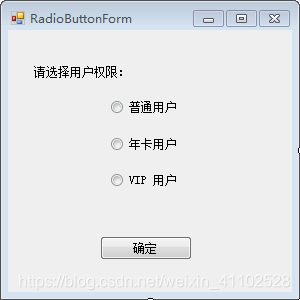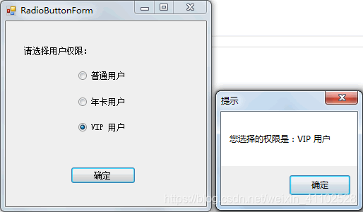 public partial class RadioButtonForm : Form { public RadioButtonForm() { InitializeComponent(); } //单击“确定”按钮的事件 private void button1_Click(object sender, EventArgs e) { string msg = ""; if (radioButton1.Checked) { msg = radioButton1.Text; } else if (radioButton2.Checked) { msg = radioButton2.Text; } else if (radioButton3.Checked) { msg = radioButton3.Text; } MessageBox.Show("您选择的权限是:" + msg, "提示"); } }