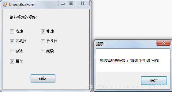 public partial class CheckBoxForm : Form { public CheckBoxForm() { InitializeComponent(); } //单击“确认”按钮,显示选择的爱好 private void button1_Click(object sender, EventArgs e) { string msg = ""; if (checkBox1.Checked) { msg = msg + " " + checkBox1.Text; } if (checkBox2.Checked) { msg = msg + " " + checkBox2.Text; } if (checkBox3.Checked) { msg = msg + " " + checkBox3.Text; } if (checkBox4.Checked) { msg = msg + " " + checkBox4.Text; } if (checkBox5.Checked) { msg = msg + " " + checkBox5.Text; } if (checkBox6.Checked) { msg = msg + " " + checkBox6.Text; } if (checkBox7.Checked) { msg = msg + " " + checkBox7.Text; } if(msg != "") { MessageBox.Show("您选择的爱好是:" + msg, "提示"); } else { MessageBox.Show("您没有选择爱好", "提示"); } } }