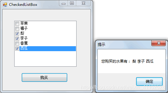 public partial class CheckedListBox : Form { public CheckedListBox() { InitializeComponent(); } //“购买”按钮的点击事件,用于在消息框中显示购买的水果种类 private void button1_Click(object sender, EventArgs e) { string msg = ""; for(int i = 0; i < checkedListBox1.CheckedItems.Count; i++) { msg = msg + " " + checkedListBox1.CheckedItems[i].ToString(); } if (msg != "") { MessageBox.Show("您购买的水果有:" + msg, "提示"); } else { MessageBox.Show("您没有选购水果!", "提示"); } } }