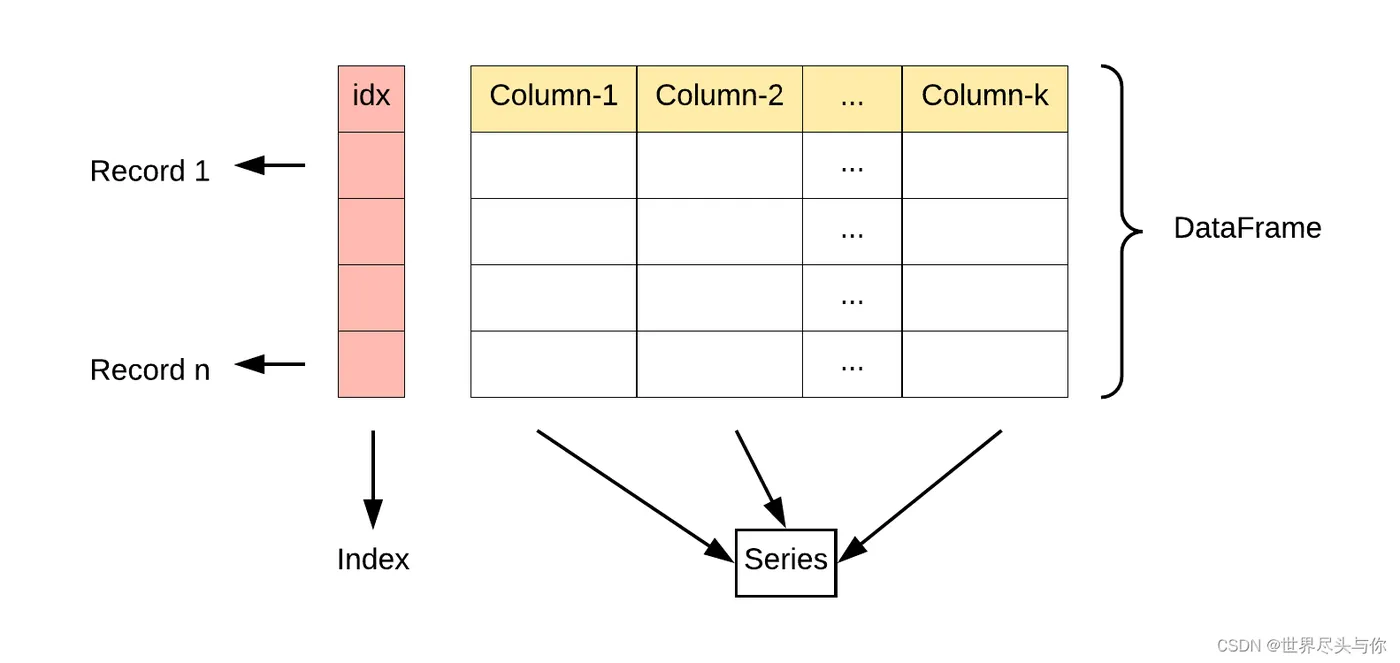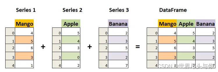 组成的字典(共同用一个索引)。Series 既有行索引也有列索引,它可以被看做由 DataFrame 是一个表格型的数据结构,它含有一组有序的列,每列可以是不同的值类型(数值、字符串、布尔型值)。DataFrame