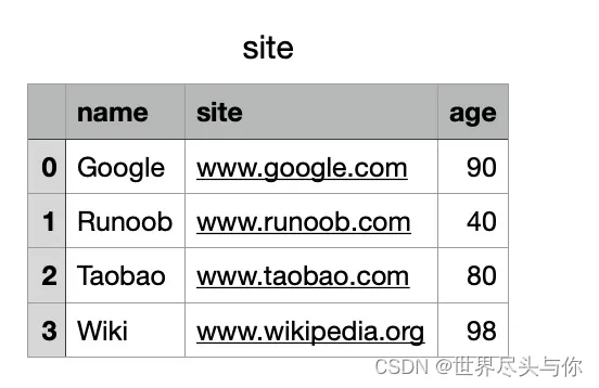 ''' 将dataframe转储为csv文件 ''' nme = ["Google", "Runoob", "Taobao", "Wiki"] st = ["www.google.com", "www.runoob.com", "www.taobao.com", "www.wikipedia.org"] ag = [90, 40, 80, 98] dict = {'name': nme, 'site': st, 'age': ag} df2 = pd.DataFrame(dict) print(df2) # name site age # 0 Google www.google.com 90 # 1 Runoob www.runoob.com 40 # 2 Taobao www.taobao.com 80 # 3 Wiki www.wikipedia.org 98 df2.to_csv('site.csv')