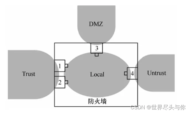 Trust区域。该区域内网络的受信任程度高,通常用来定义内部用户所在的网络。
