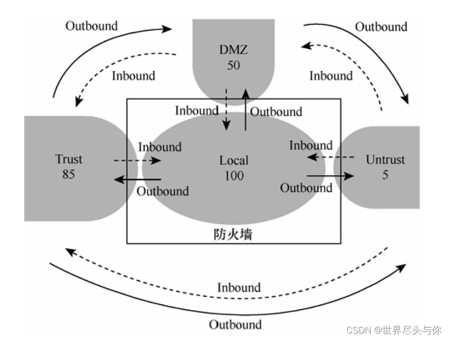 报文从低级别的安全区域向高级别的安全区域流动时为入方向(Inbound),报文从由高级别的安全区域向低级别的安全区域流动时为出方向(Outbound)💕