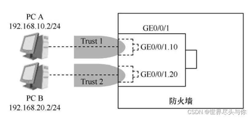 我们在接口GE0/0/1下创建两个子接口GE0/0/1.10和GE0/0/1.20,分别对应VLAN 10和VLAN 20,然后将这两个子接口划分到不同的安全区域,而接口GE0/0/1不用加入安全区域,即可实现将PC A和PC B划分到不同安全区域的目的