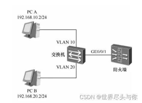 我们可以在防火墙上创建两个VLAN并为各自的VLANIF接口配置IP地址,然后配置接口GE0/0/1工作在二层模式(透明模式),允许VLAN 10和VLAN 20的报文通过。将VLANIF10和VLANIF20划分到不同的安全区域,而接口GE0/0/1不用加入安全区域,即可实现将PC A和PC B划分到不同安全区域的目的