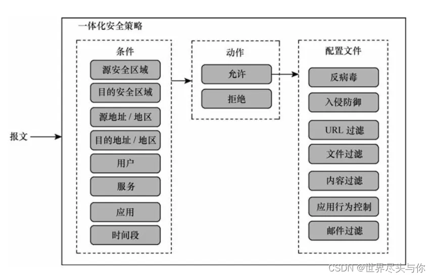 所谓的一体化,主要包括两个方面的内容:其一是配置上的一体化,像反病毒、入侵防御、URL过滤、邮件过滤等安全功能都可以在安全策略中引用安全配置文件来实现,降低了配置难度;其二是业务处理上的一体化,安全策略对报文进行一次检测,多业务并行处理,大幅度提升了系统性能。