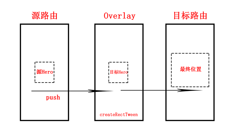 如上图所示,两个路由之间还有一个Overlay层。在动画开始时,Flutter会计算出Hero的位置并复制一份,然后绘制到Overlay层上。复制的Hero和源Hero的大小是一致的,并且该Hero是在所有路由之上。在动画实现的过程中,Flutter会逐渐把源Hero移除屏幕。在动画进行中Flutter是依靠Tween来实现,通过createRectTween属性把Tween传给Hero。Hero内部默认使用MeterialRectArcTween的曲线路径进行移动动画的操作。在动画结束时,Flutter将Overlay中的Hero移除,且完成了Hero在目标路由上的显示,这时Overlay是空白的。