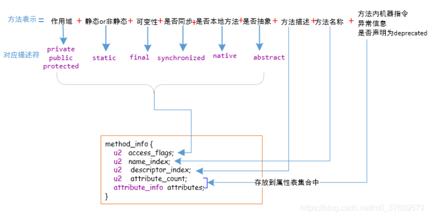 method_info{ access_flag;//访问修饰符 name_index;//方法名称(这里是常量池中的index) descriptor_index;//参数的类型以及返回值得类型(同样指向常量池得编号) attributes_count;//属性个数 attibutes;//属性表(这里得属性个数及属性表都放在属性表中得‘Code’属性里面) }