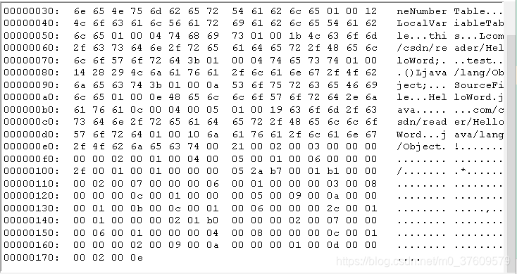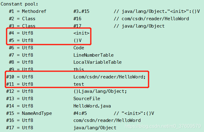 public class com.csdn.reader.HelloWord minor version: 0 major version: 52 flags: ACC_PUBLIC, ACC_SUPER Constant pool: #1 = Methodref #3.#15 // java/lang/Object."<init>":()V #2 = Class #16 // com/csdn/reader/HelloWord #3 = Class #17 // java/lang/Object #4 = Utf8 <init> #5 = Utf8 ()V #6 = Utf8 Code #7 = Utf8 LineNumberTable #8 = Utf8 LocalVariableTable #9 = Utf8 this #10 = Utf8 Lcom/csdn/reader/HelloWord; #11 = Utf8 test #12 = Utf8 ()Ljava/lang/Object; #13 = Utf8 SourceFile #14 = Utf8 HelloWord.java #15 = NameAndType #4:#5 // "<init>":()V #16 = Utf8 com/csdn/reader/HelloWord #17 = Utf8 java/lang/Object { public com.csdn.reader.HelloWord(); descriptor: ()V flags: ACC_PUBLIC Code: stack=1, locals=1, args_size=1 0: aload_0 1: invokespecial #1 // Method java/lang/Object."<init>":()V 4: return LineNumberTable: line 3: 0 LocalVariableTable: Start Length Slot Name Signature 0 5 0 this Lcom/csdn/reader/HelloWord; public java.lang.Object test(); descriptor: ()Ljava/lang/Object; flags: ACC_PUBLIC Code: stack=1, locals=1, args_size=1 0: aconst_null 1: areturn LineNumberTable: line 4: 0 LocalVariableTable: Start Length Slot Name Signature 0 2 0 this Lcom/csdn/reader/HelloWord; } SourceFile: "HelloWord.java"