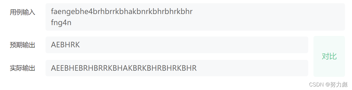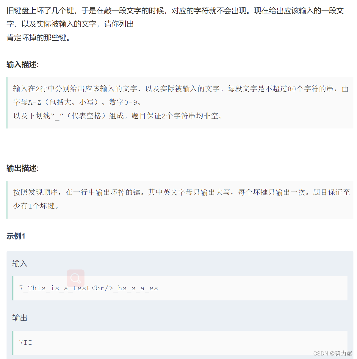 import java.util.*; public class Main { public static void func(String strExc,String strAct){ //set1用于存放实际输入的值,也就是我们的strAct HashSet<Character> set1 = new HashSet<>(); //因为题目中说了要忽略小写,都为大写,所以用toUpperCase方法 for(char c:strAct.toUpperCase().toCharArray()){ set1.add(c); } //set2是为了避免重复设置的集合,主要存储最终要输出的元素. //set2主要存储最终要输出的值 HashSet<Character> set2 = new HashSet<>(); for(char c:strExc.toUpperCase().toCharArray()){ //注意这里要进行两次判断,是因为假设只有判断set1当中的元素是否存在于c中的字符,此时结果会重复 if(!set1.contains(c)&&!set2.contains(c)) { set2.add(c); System.out.print(c); } } } public static void main(String[] args) { Scanner sc = new Scanner(System.in); //我们本来想要得到的输入的值 String strExc = sc.nextLine(); //最终实际输入的值 String strAct = sc.nextLine(); func(strExc,strAct); } }