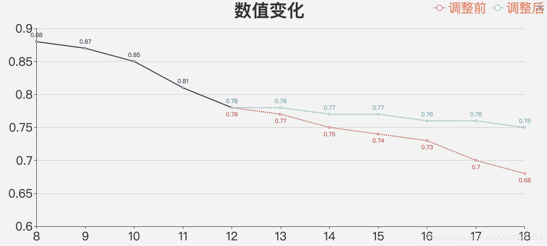 # 算法思想:把两条线拆成四条线来做 def draw_picture(): columns = [8,9,10,11,12,13,14,15,16,17,18] columns = [str(item) for item in columns] y1 = [0.88,0.87,0.85,0.81,0.78,'-','-','-','-','-','-'] y2 = [0.88,0.87,0.85,0.81,0.78,'-','-','-','-','-','-' ] y3 = ['-','-','-','-',0.78,0.77,0.75,0.74,0.73,0.70,0.68] y4 = ['-','-','-','-',0.78,0.78,0.77,0.77,0.76,0.76,0.75 ] line = Line("数值变化") line.add('调整前', columns, y1, is_label_show = True, yaxis_min = 0.5,label_pos = 'bottom') line.add('调整后',columns,y2,is_label_show = True, yaxis_min = 0.5,) line.add('调整前', columns, y3, is_label_show = True, yaxis_min = 0.5,label_pos = 'bottom',mark_point_symbol='diamond',line_type = 'dashed') line.add('调整后',columns,y4,is_label_show = True, yaxis_min = 0.5,mark_point_symbol='diamond',line_type = 'dashed') line.render("example.html")