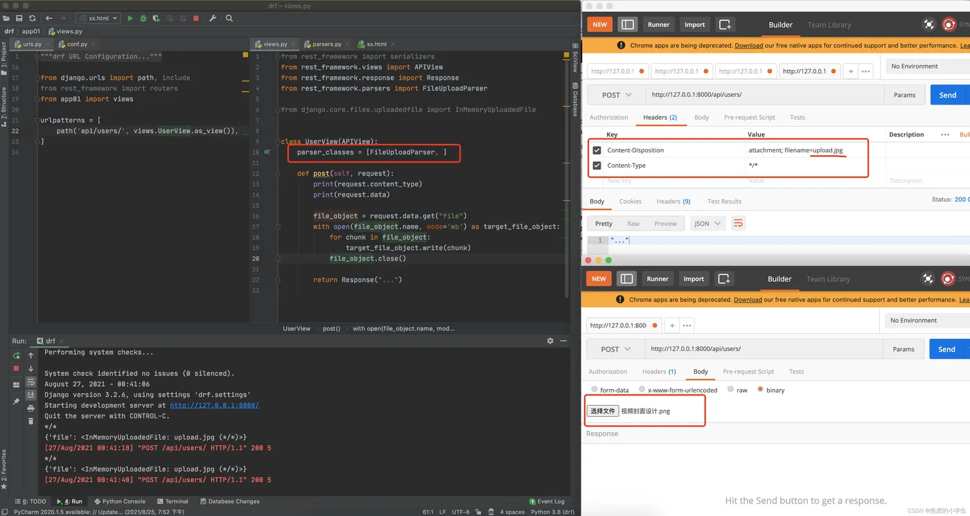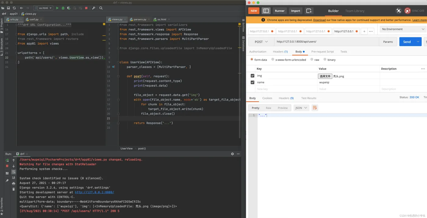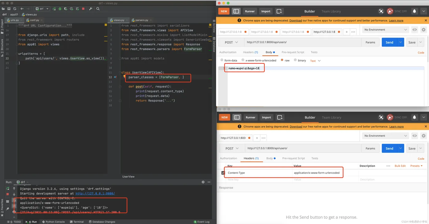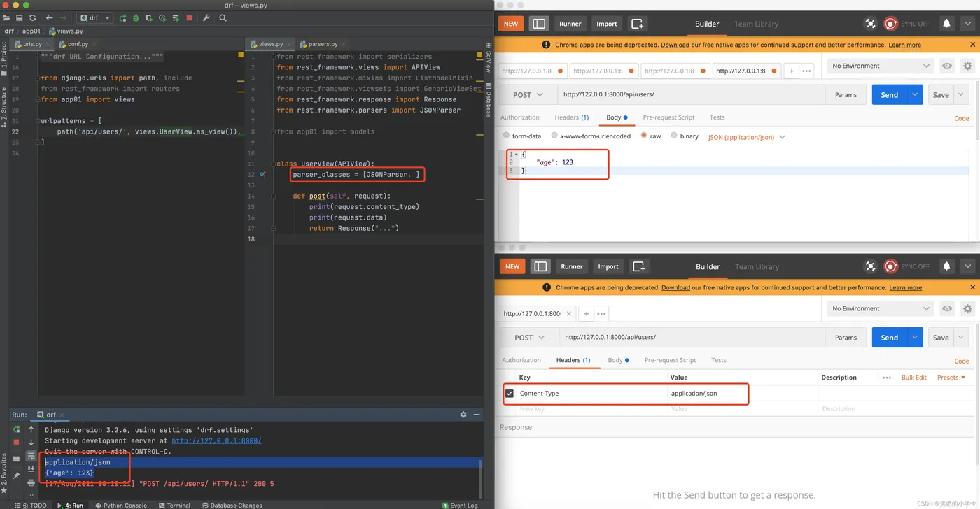 的数据怎么来的呢?其实在drf内部是由解析器,根据请求者传入的数据格式 + 请求头来进行处理。