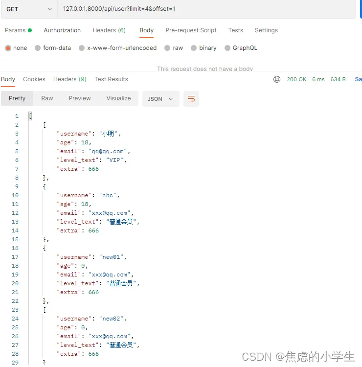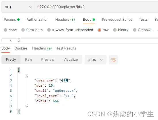 此时get: 127.0.0.1:8000/api/user?id=2 和 127.0.0.1:8000/api/user/2/效果基本是一样