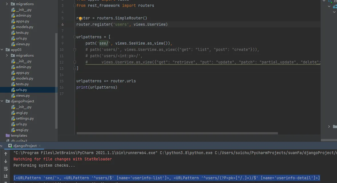 from rest_framework import routers from app01 import views router = routers.SimpleRouter() router.register(r'api/users', views.UserView) #这里users后面不要加/了 urlpatterns = [ # 其他URL # path('xxxx/', xxxx.as_view()), ] urlpatterns += router.urls