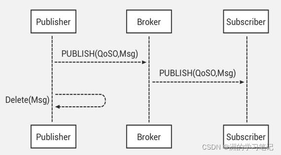 当 QoS 为 0 时,消息的分发依赖于底层网络的能力。发布者只会发布一次消息,接收者不会应答消息,发布者也不会储存和重发消息。消息在这个等级下具有最高的传输效率,但可能送达一次也可能根本没送达。