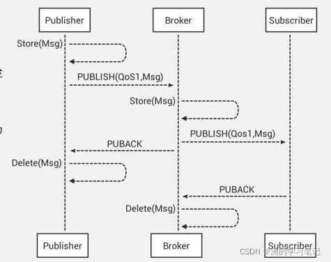 当 QoS 为 1 时,可以保证消息至少送达一次。MQTT 通过简单的 ACK 机制来保证 QoS 1。发布者会发布消息,并等待接收者的 PUBACK 报文的应答,如果在规定的时间内没有收到 PUBACK 的应答,发布者会将消息的 DUP 置为 1 并重发消息。接收者接收到 QoS 为 1 的消息时应该回应 PUBACK 报文,接收者可能会多次接受同一个消息,无论 DUP 标志如何,接收者都会将收到的消息当作一个新的消息并发送 PUBACK 报文应答。