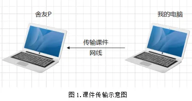 假设电脑中有一个类似USB端口,将之命名为网口。通过一根特制网线(双绞线),可将我的电脑和舍友P的电脑连接。即可假设此时就可以进行课件PPT传输了。如下图1所示。