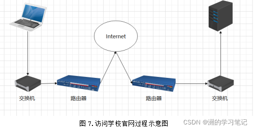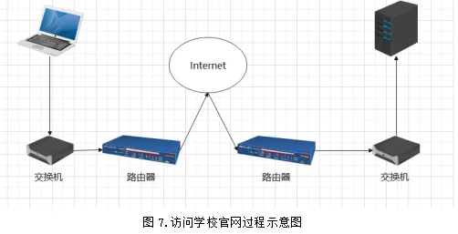 第三步:路由器连接互联网Internet,路由器根据路由表和路由选择算法等选择一条合适的路径将数据传输到学校官网所在的服务器。这个路径中可能包含其他的局域网、广域网、路由器等等。