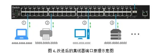 为了解决上述错误,舍友K提出可将集线器进行改进,并让电脑在传输前先发出某条指令,指令中包含目的网口名称及地址,让改进的集线器根据指令中的网口名称及对应地址(可理解为MAC地址表)进行寻址与传输。改进原理图如下图3、4所示。
