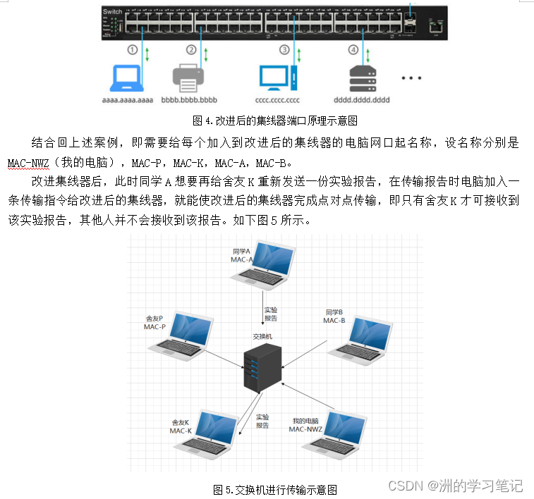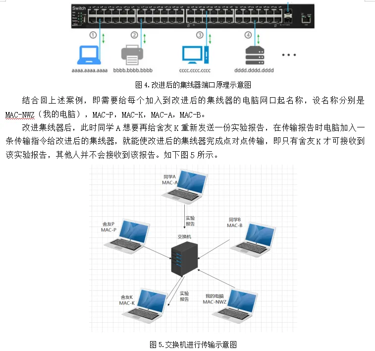 改进集线器后,此时同学A想要再给舍友K重新发送一份实验报告,在传输报告时电脑加入一条传输指令给改进后的集线器,就能使改进后的集线器完成点对点传输,即只有舍友K才可接收到该实验报告,其他人并不会接收到该报告。如下图5所示。