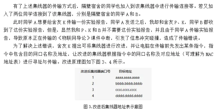 此时同学A想要给舍友K传输一份实验报告,同学A发送之后,我却和舍友P、K,同学B都收到了这份实验报告,但是,显然我和P、K和B并不需要这份实验报告,并且由于同学A传输实验报告,导致原本正在传输的《物联网导论》课件中断,引发了信息冲突碰撞,造成了传输错误。