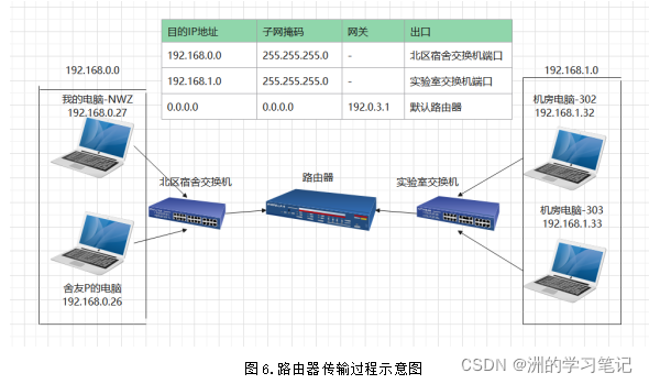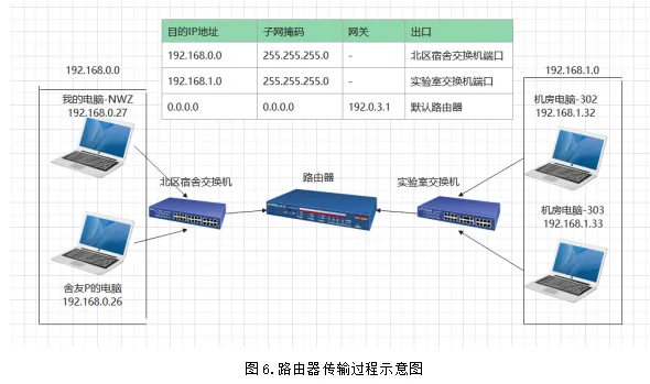 假设发送资料给实验室机房电脑302,那么目的地址就是192.168.1.32/24。首先电脑将会将资料传输到北区宿舍交换机,而后交换机传输到路由器,路由器通过192.168.1.32/24可以获得目的地址为192.168.1.0,查询路由表可以知道,目的地址在“实验室交换机端口”,那么就会把提纲传输到实验室交换机,进而实验室交换机通过MAC地址表把资料传输给机房电脑302。特别地,如果路由表找不到目的IP地址的对应出口,那么就会发送到默认端口中。