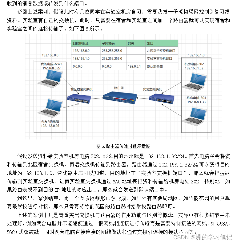 谈回上述案例,假设此时有几位同学在实验室机房自习,需要我发一份《物联网控制》复习提资料。实验室有自己的交换机,此时,只需要在宿舍和实验室之间加一个路由器就可以实现宿舍和实验室之间的连接传输了。如下图6所示。