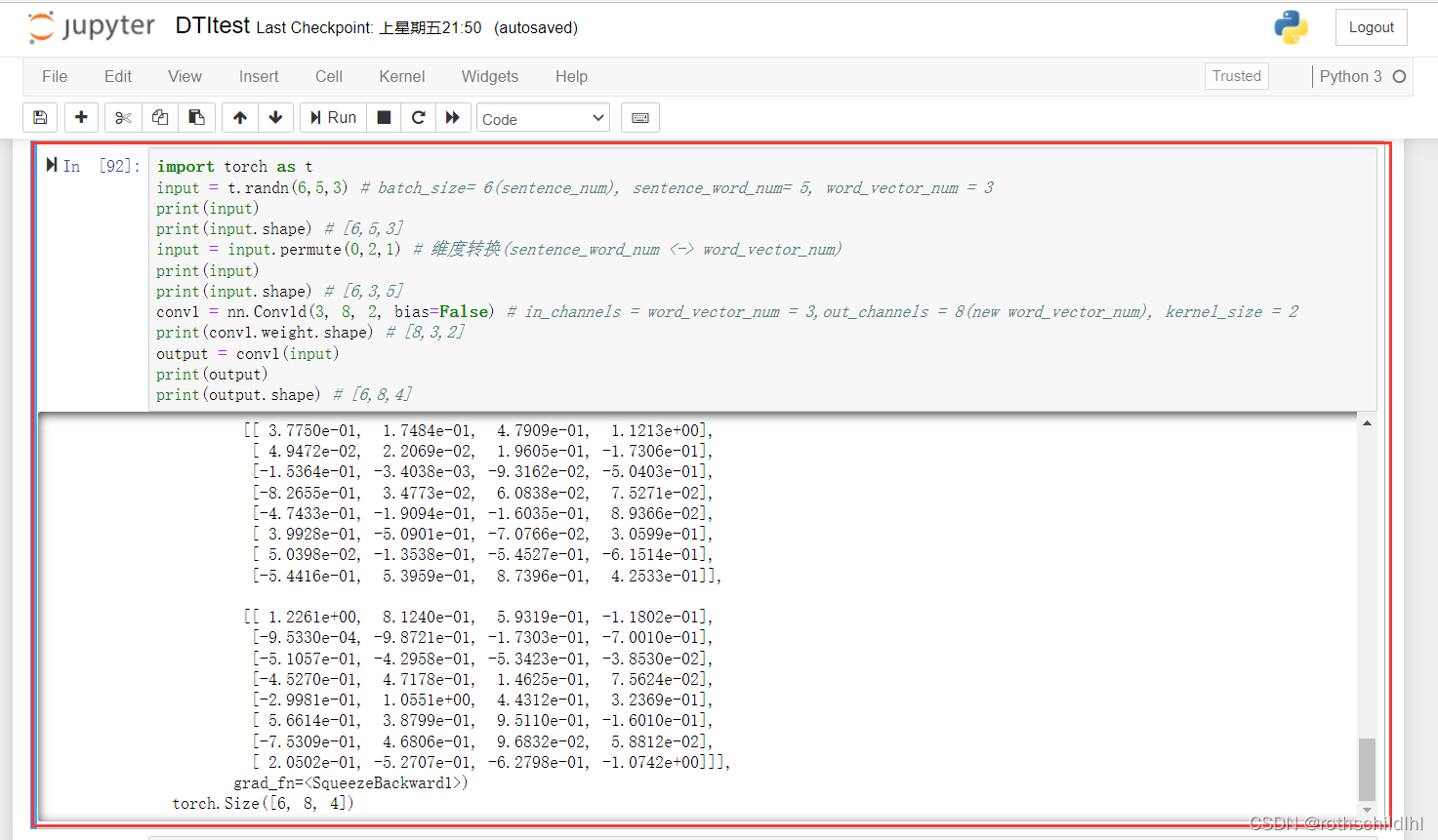 import torch as t input = t.randn(6,5,3) # batch_size= 6(sentence_num), sentence_word_num= 5, word_vector_num = 3 print(input) print(input.shape) # [6,5,3] input = input.permute(0,2,1) # 维度转换(sentence_word_num <-> word_vector_num) print(input) print(input.shape) # [6,3,5] conv1 = nn.Conv1d(3, 8, 2, bias=False) # in_channels = word_vector_num = 3,out_channels = 8(new word_vector_num), kernel_size = 2 print(conv1.weight.shape) # [8,3,2] output = conv1(input) print(output) print(output.shape) # [6,8,4]