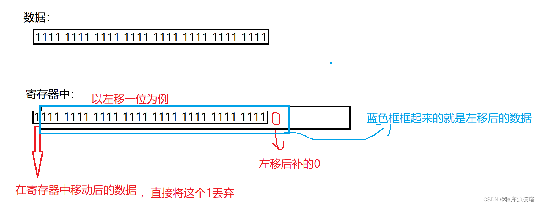 那么,在实际移动的过程中,是在寄存器中进行的,即大小固定的单位内。 那么,左移右移一定会有位置跑到"外边"的情况,跑到外面的数字在之后使用提取数据时无法复原,这就叫做丢弃