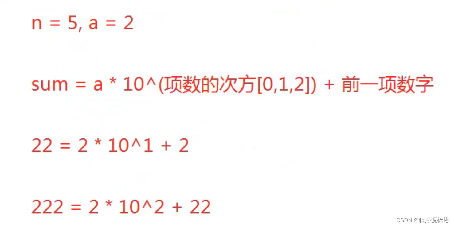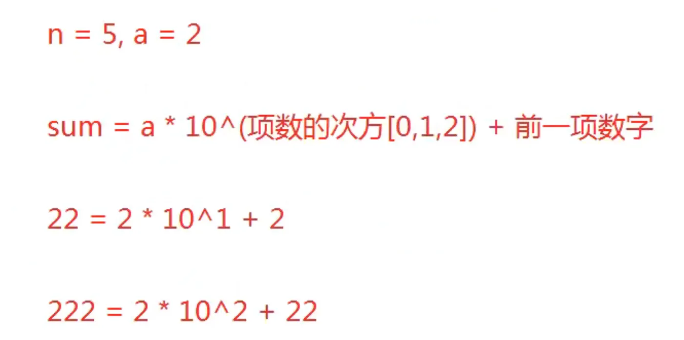 #include <stdio.h> #include <math.h> int main() { //n为a的个数 int n; double a, signle_num = 0.0, total_sum = 0.0; printf("请输入a的值以及n的值: "); scanf("%lf %d", &a, &n); //循环n次求总和 for (int i = 0; i < n; i++) { signle_num += a * pow(10, i);//这里就是每一项数的值 total_sum += signle_num;//每一项相加 } printf("总和为:%lf\n", total_sum); return 0; }