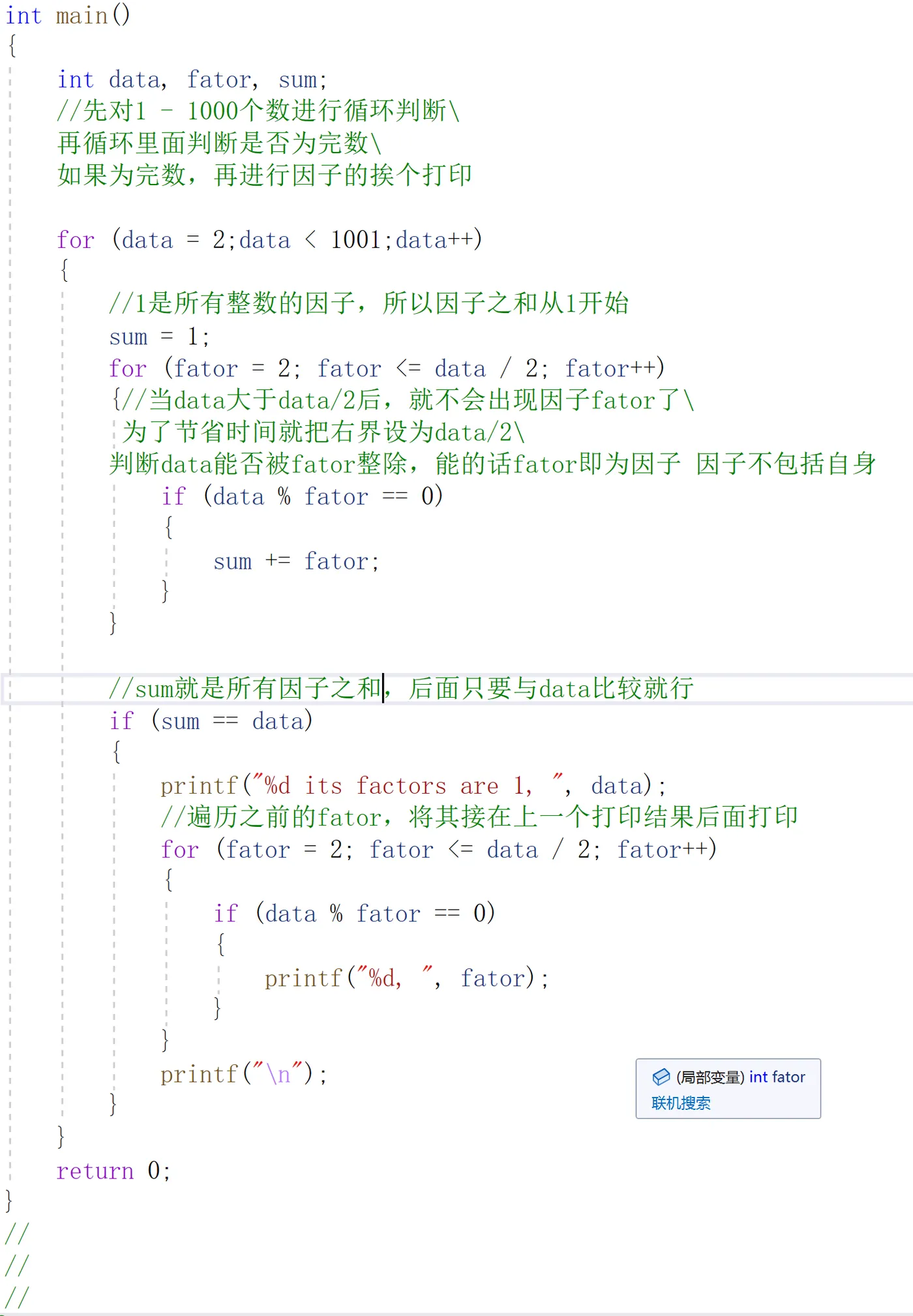 8. 一个数如果恰好等于它的因子之和,这个数就称为“完数”。例如,6的因子为1,2,3,而6=1+2+3,因此6是“完数”。编程序找出1000之内的所有完数,并按下面格式输出其因子: 6 its factors are 1,2,3