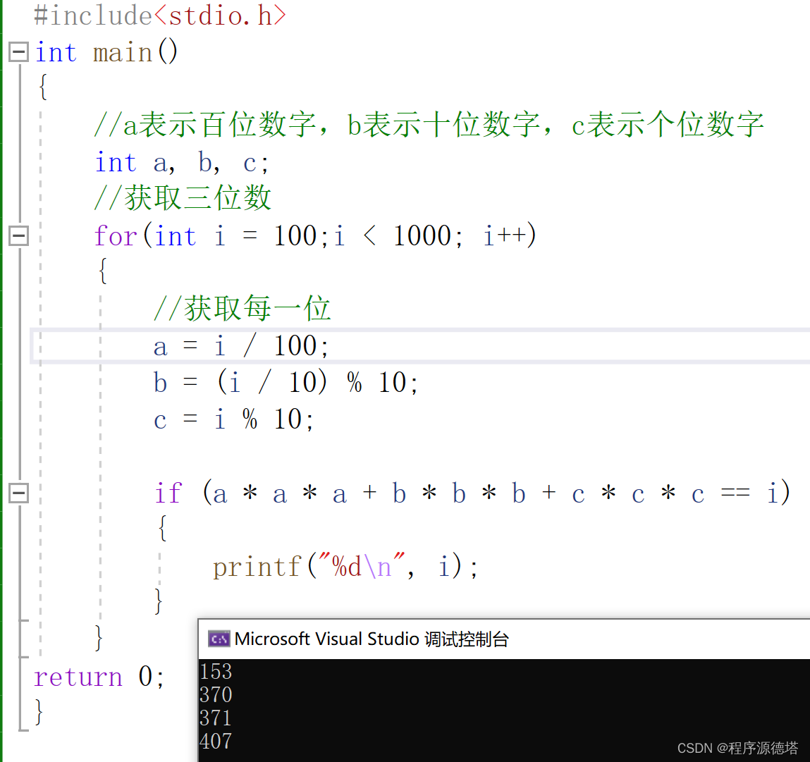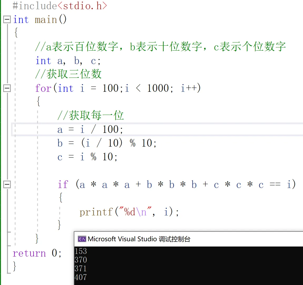 #include<stdio.h> int main() { //a表示百位数字,b表示十位数字,c表示个位数字 int a,b,c; //获取三位数 for(int i = 100;i <= 999; i++) { //获取每一位 a = i/100; b = (i/10)%10; c = i%10; if(a*a*a+b*b*b+c*c*c == i) { printf("%d\n",i); } } return 0; }